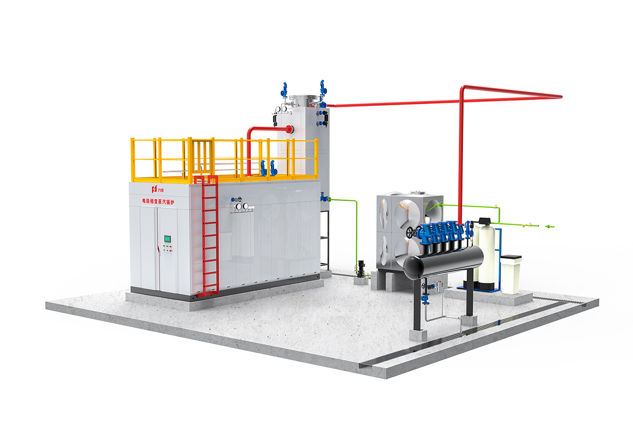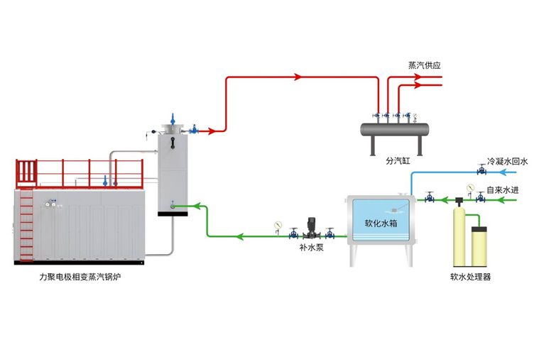 電極相變鍋爐是5001拉斯維加斯獨(dú)創(chuàng)的一種在鍋爐內(nèi)部實(shí)現(xiàn)相變換熱的電極鍋爐。它主要由電極筒、介質(zhì)筒、換熱器以及控制裝置組成。三相電極固定在電極筒內(nèi),浸在具有一定電導(dǎo)率的熱媒水中,三相電極通電后直接加熱熱媒水,在電流的作用下,熱媒水被迅速加熱汽化變成熱媒蒸汽,蒸汽上升到換熱器管外,將熱量傳遞給換熱器管內(nèi)的冷水,對(duì)外輸出蒸汽。而熱媒蒸汽凝結(jié)成水滴回到熱媒水中重新被加熱汽化,完成整個(gè)循環(huán)。在機(jī)組運(yùn)行中,熱媒水封閉在筒體內(nèi)不斷地汽化-冷凝-汽化往復(fù)循環(huán),實(shí)現(xiàn)電能向熱能的轉(zhuǎn)換。